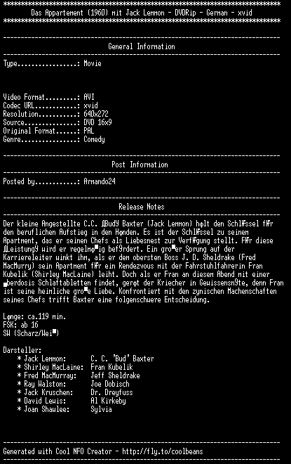 | FiLENAME: | 091.Das.Appartement.1960.German.DVDRip.Xvid.avi |