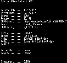 | FiLENAME: | Gib.dem.Affen.Zucker.German.REMASTERED.1981.AC3.BDRip.x264-SPiCY.mkv |