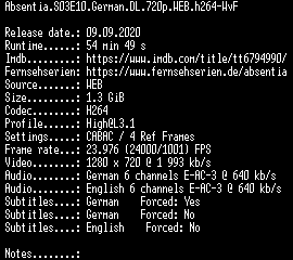 | FiLENAME: | Absentia.S03E10.German.DL.720p.WEB.h264-WvF.mkv |