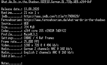 | FiLENAME: | What.We.Do.in.the.Shadows.S02E10.German.DL.720p.WEB.x264-WvF.mkv |