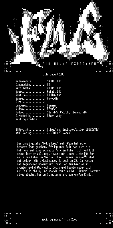 | FiLENAME: | Tolle.Lage.German.2000.DVDRIP.XViD-FmE.avi |