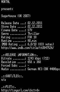 | FiLENAME: | Sugarhouse.2007.German.AC3.DVDRip.XviD-MORTAL.avi |