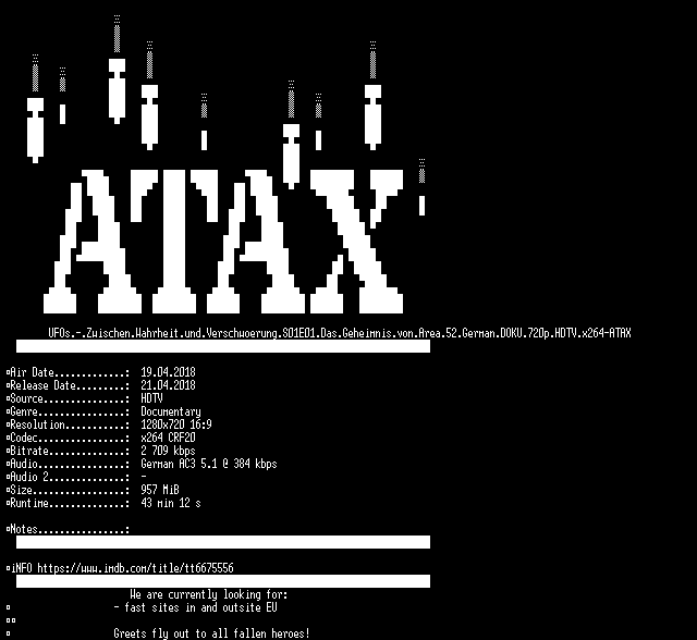 | FiLENAME: | UFOs.-.Zwischen.Wahrheit.und.Verschwoerung.S01E01.Das.Geheimnis.von.Area.52.German.DOKU.720p.HDTV.x264-ATAX.mkv |
