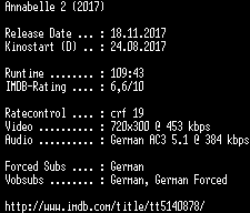 | FiLENAME: | Annabelle.2.German.2017.AC3.BDRip.x264-COiNCiDENCE.mkv |