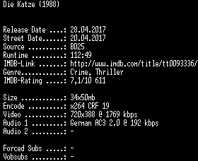 | FiLENAME: | Die.Katze.German.REMASTERED.1988.AC3.BDRip.x264-SPiCY.mkv |