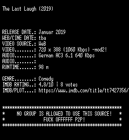 | FiLENAME: | The.Last.Laugh.2019.German.WebRip.x264-SLG.mkv |