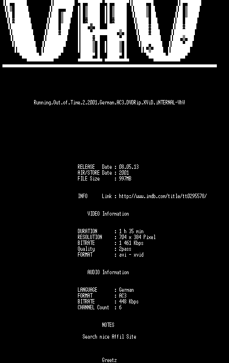 | FiLENAME: | Running.Out.of.Time.2.2001.German.AC3.DVDRip.XViD.iNTERNAL-VhV.avi |