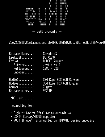 | FiLENAME: | Zoo.S03E03.Gestaendnisse.GERMAN.DUBBED.DL.720p.WebHD.h264-euHD.mkv |