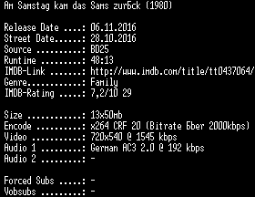 | FiLENAME: | Am.Samstag.kam.das.Sams.zurueck.German.REMASTERED.1980.AC3.BDRip.x264-SPiCY.mkv |