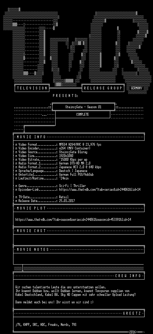 | FiLENAME: | Steins.Gate.S01E01.Prolog.vom.Anfang.und.Ende.GERMAN.DL.DTSMA.ANIME.1080p.BDRiP.x264-TvR.mkv |