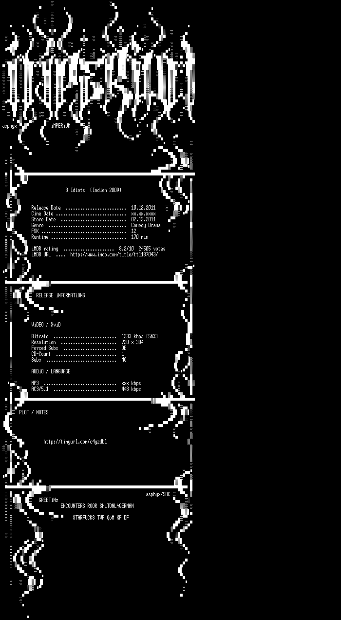 | FiLENAME: | 3.Idiots.German.2009.AC3.DVDRip.XviD-iMPERiUM.avi |