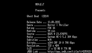 | FiLENAME: | Ghost.Boat.German.2014.AC3.BDRip.x264-MOViEiT.mkv |