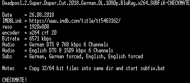 | FiLENAME: | Deadpool.2.Super.Duper.Cut.2018.German.DL.1080p.BluRay.x264.SUBFiX-CHECKMATE.mkv |