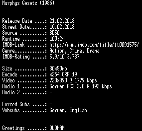 | FiLENAME: | Murphys.Gesetz.German.REMASTERED.1986.AC3.BDRip.x264-SPiCY.mkv |