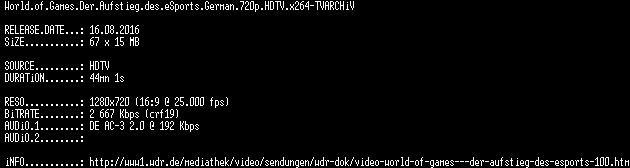 | FiLENAME: | World.of.Games.Der.Aufstieg.des.eSports.German.DOKU.720p.HDTV.x264-TVARCHiV.mkv |