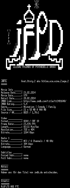 | FiLENAME: | Goat.Story.2.German.2012.AC3.BDRiP.x264-iFPD.mkv |