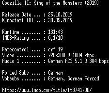 | FiLENAME: | Godzilla.II.King.of.the.Monsters.German.2019.AC3.BDRip.x264-COiNCiDENCE.mkv |