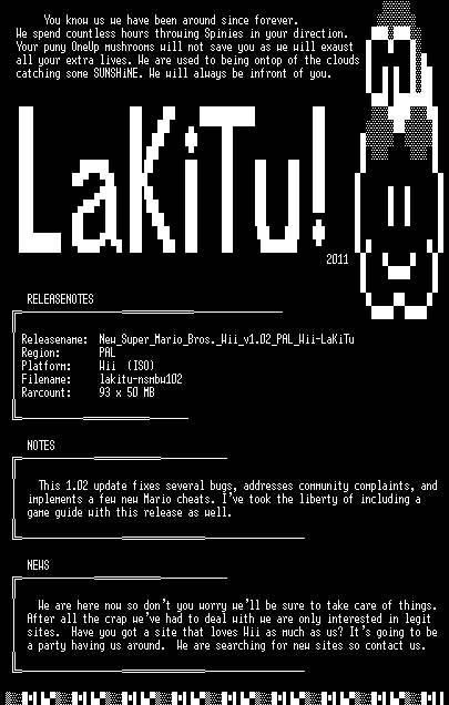 | FiLENAME: | New.Super.Mario.Bros.Wii.v1.02.PAL.Wii-LaKiTu.iso |