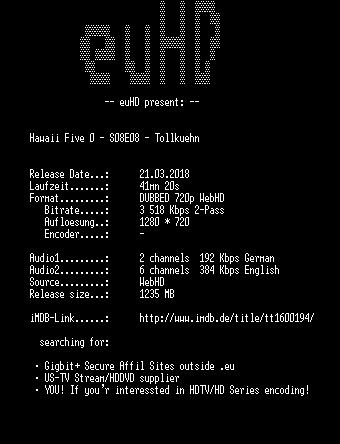 | FiLENAME: | Hawaii.Five.0.S08E08.Tollkuehn.GERMAN.DUBBED.DL.720p.WebHD.h264-euHD.mkv |