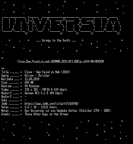 | FiLENAME: | Close.Dem.Feind.zu.nah.GERMAN.2019.AC3.BDRip.x264-UNiVERSUM.mkv |