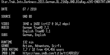| FiLENAME: | Star.Trek.Into.Darkness.2013.German.DL.2160p.UHD.BluRay.x265-ENDSTATiON.mkv |