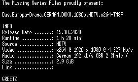 | FiLENAME: | Das.Europa-Drama.GERMAN.DOKU.1080p.HDTV.x264-TMSF.mkv |