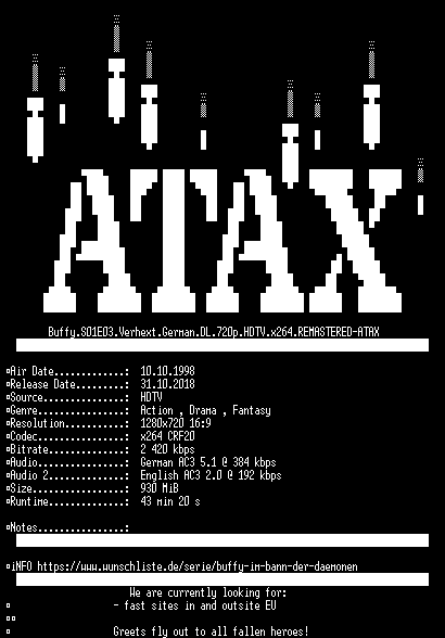 | FiLENAME: | Buffy.S01E03.Verhext.German.DL.720p.HDTV.x264.REMASTERED-ATAX.mkv |