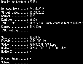 | FiLENAME: | Das.kalte.Gericht.German.2015.AC3.BDRip.x264-SPiCY.mkv |