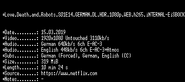 | FiLENAME: | Love.Death.and.Robots.S01E14.GERMAN.DL.HDR.1080p.WEB.h265.iNTERNAL-EiSBOCK.mkv |