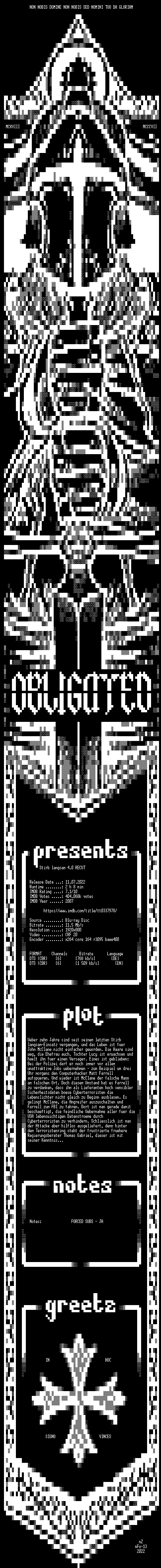 | FiLENAME: | Stirb.langsam.4.0.RECUT.2007.German.DL.1080p.BluRay.x264-OBLiGATED.mkv |