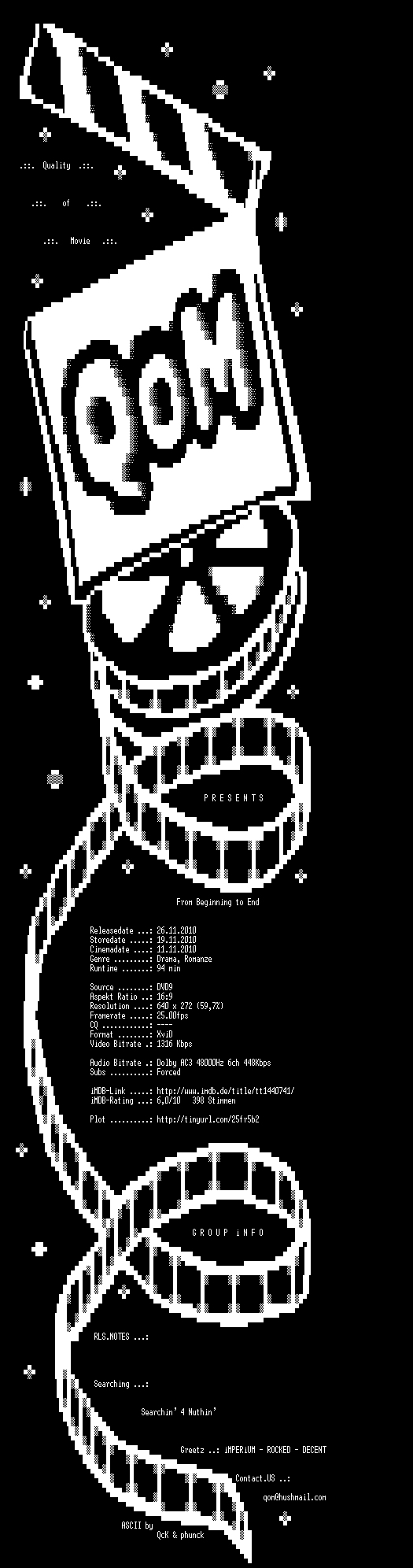 | FiLENAME: | From.Beginning.to.End.German.2009.AC3.DVDRip.XviD-QoM.avi |
