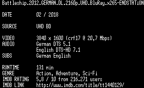 | FiLENAME: | Battleship.2012.GERMAN.DL.2160p.UHD.BluRay.x265-ENDSTATiON.mkv |