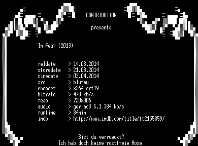 | FiLENAME: | In.Fear.2013.German.BDRip.x264-CONTRiBUTiON.mkv |