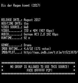 | FiLENAME: | Bis.der.Regen.kommt.2017.German.WebRip.x264-SLG.mkv |
