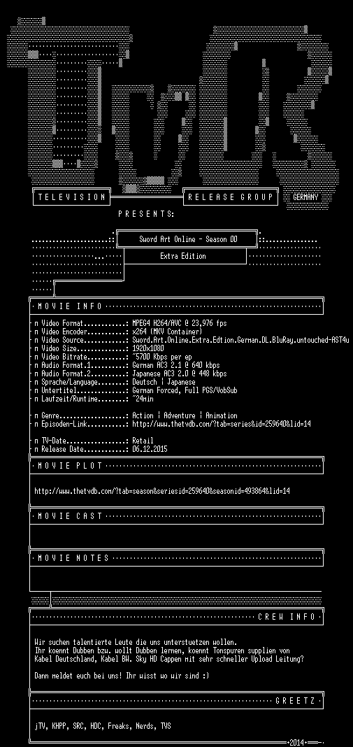 | FiLENAME: | Sword.Art.Online.S00E10.Sword.Art.Online.Extra.Edition.GERMAN.DL.AC3.ANiME.BDRiP.1080p.WS.x264-TvR.mkv |