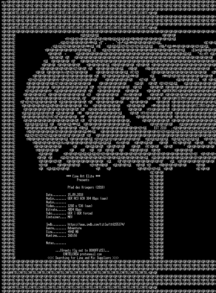 | FiLENAME: | Pfad.des.Kriegers.2018.GERMAN.AC3.720p.WebHD.h264-CARTEL.mkv |