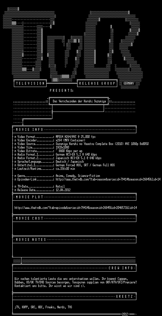 | FiLENAME: | Das.Verschwinden.der.Haruhi.Suzumiya.GERMAN.5.1.DUBBED.ANiME.DL.BDRiP.1080p.WS.x264-TvR.mkv |