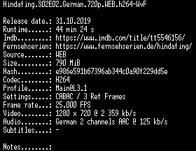 | FiLENAME: | Hindafing.S02E02.German.720p.WEB.h264-WvF.mkv |