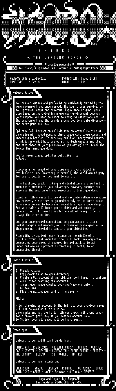 | FiLENAME: | Tom.Clancys.Splinter.Cell.Conviction.Multiplayer.Crack-SKIDROW.rar |