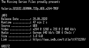 | FiLENAME: | Valeria.S01E02.GERMAN.720p.WEB.x264-TMSF.mkv |