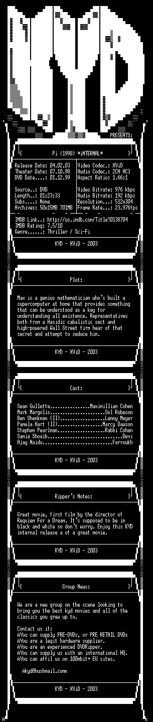 | FiLENAME: | Pi.1998.iNTERNAL.DVDRip.XViD-KYD.avi |