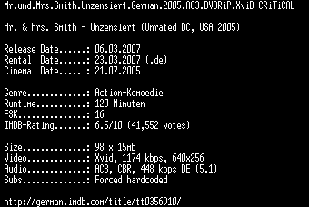 | FiLENAME: | Mr.und.Mrs.Smith.Unzensiert.German.2005.AC3.DVDRiP.XviD-CRiTiCAL.CD1.avi |