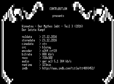 | FiLENAME: | Winnetou.Der.Mythos.lebt.Teil.3.2016.German.BDRip.x264-CONTRiBUTiON.mkv |
