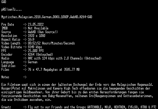 | FiLENAME: | Mystisches.Malaysien.2018.German.DOKU.1080P.WebHD.H264-GWD.mkv |