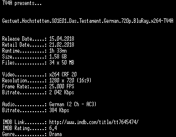 | FiLENAME: | Gestuet.Hochstetten.S01E01.Das.Testament.German.720p.BluRay.x264-TV4A.mkv |
