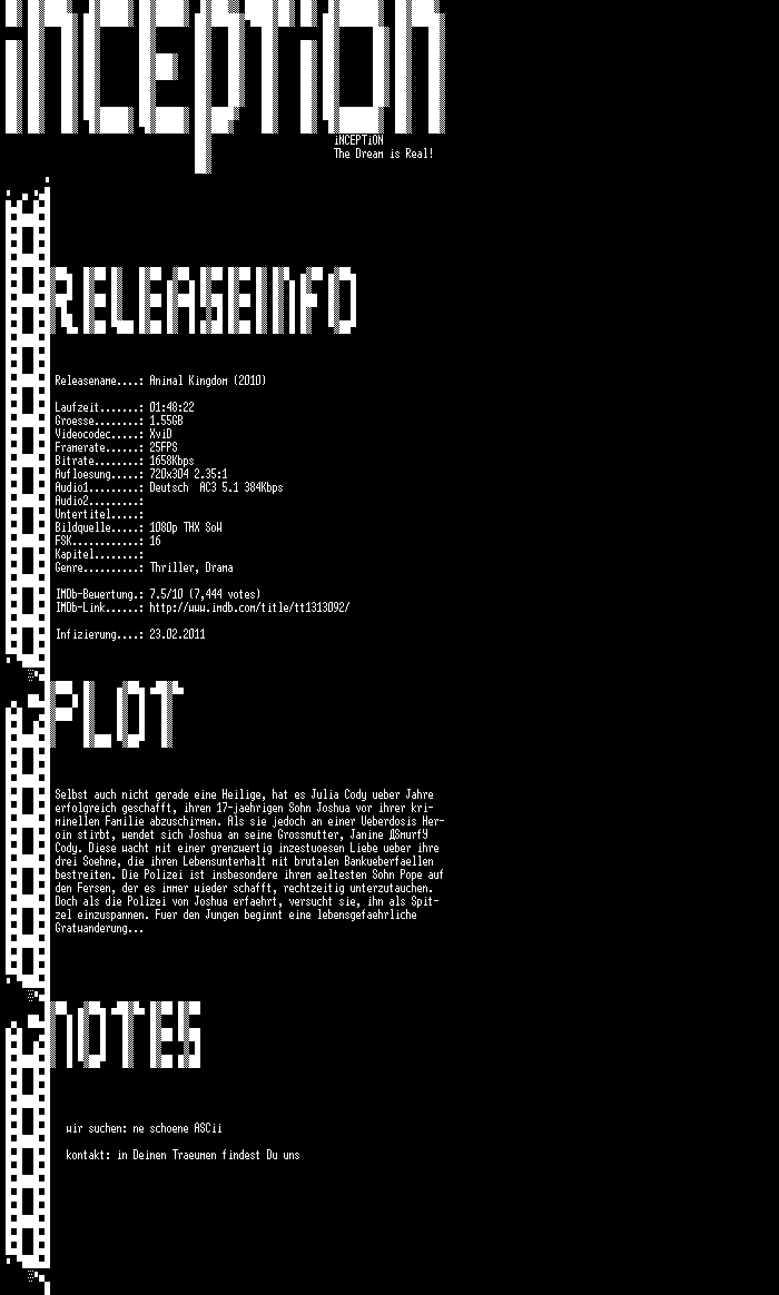 | FiLENAME: | Koenigreich.des.Verbrechens.2010.German.AC3.HDRip.XviD-iNCEPTiON.avi |