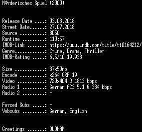 | FiLENAME: | Moerderisches.Spiel.German.REMASTERED.2000.AC3.BDRip.x264-SPiCY.mkv |