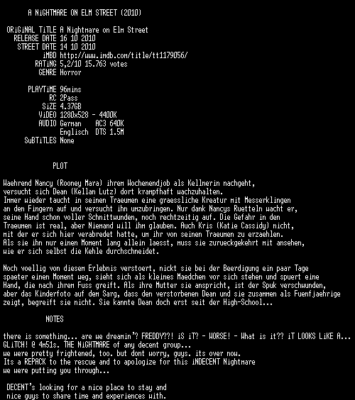 | FiLENAME: | A Nightmare on Elm Street (2010) [DL 720p BD].mkv |