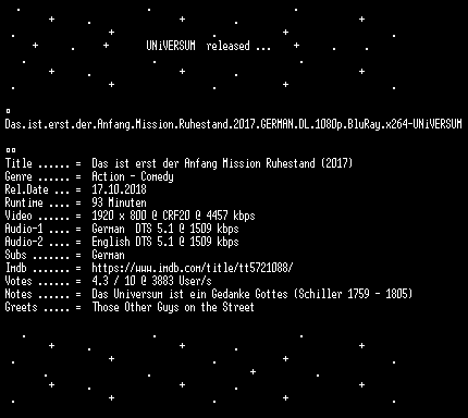 | FiLENAME: | Das.ist.erst.der.Anfang.Mission.Ruhestand.2017.GERMAN.DL.1080p.BluRay.x264-UNiVERSUM.mkv |