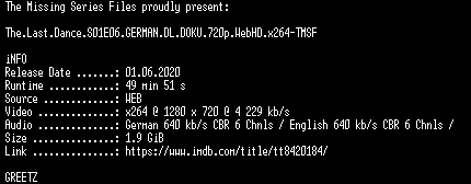 | FiLENAME: | The.Last.Dance.S01E06.GERMAN.DL.DOKU.720p.WebHD.x264-TMSF.mkv |